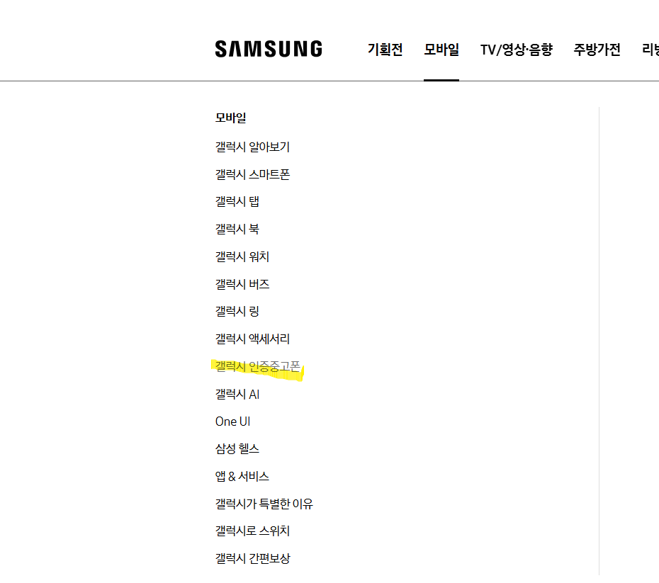 ‘갤럭시 인증 중고폰’ 메뉴가 따로 있어요.