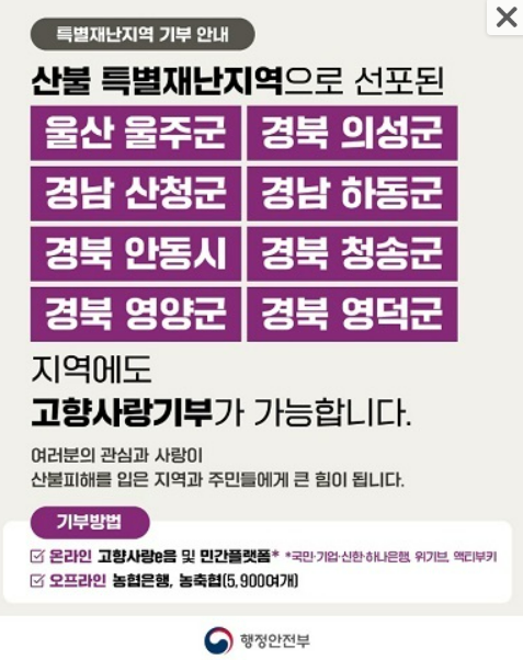 그래서 오늘은 산불 피해 복구를 위한 후원금 기부 방법을 소개해드릴게요.