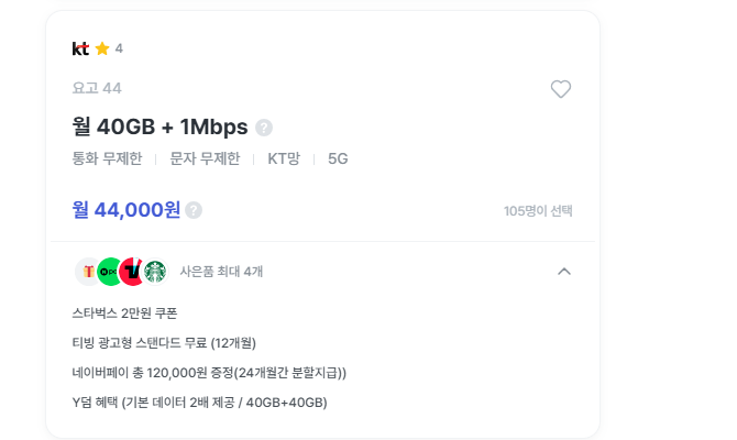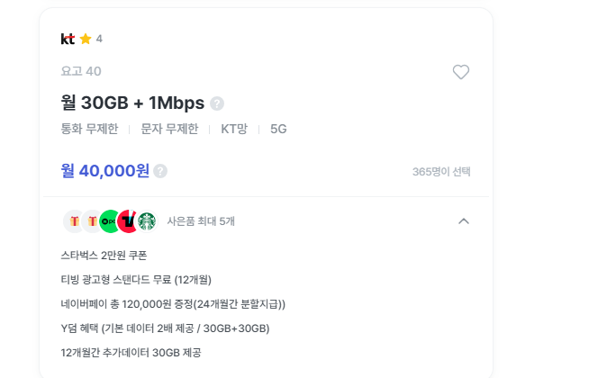→ 티빙 6개월 무료 + 스타벅스 + 데이터 더블 - 월 40,000원 / 30GB + 1Mbps