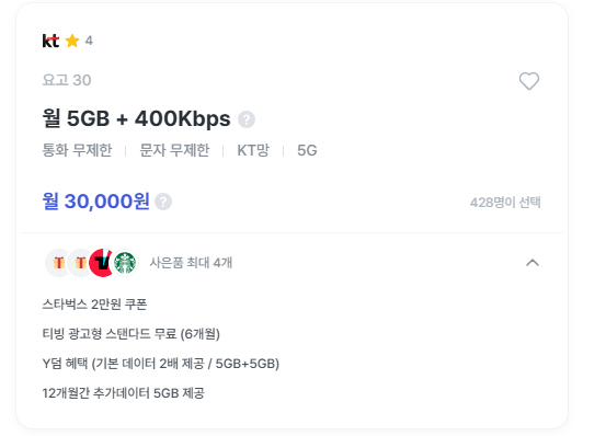 - 월 30,000원 / 5GB + 400Kbps
