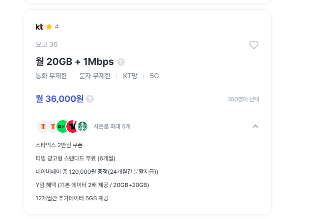 → 티빙 6개월 무료 + 스타벅스 쿠폰 + 추가데이터 - 월 36,000원 / 20GB + 1Mbps