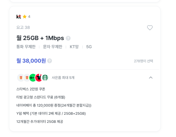 → 티빙 6개월 무료 + Y청년혜택 + 네이버페이 제공 - 월 38,000원 / 25GB + 1Mbps