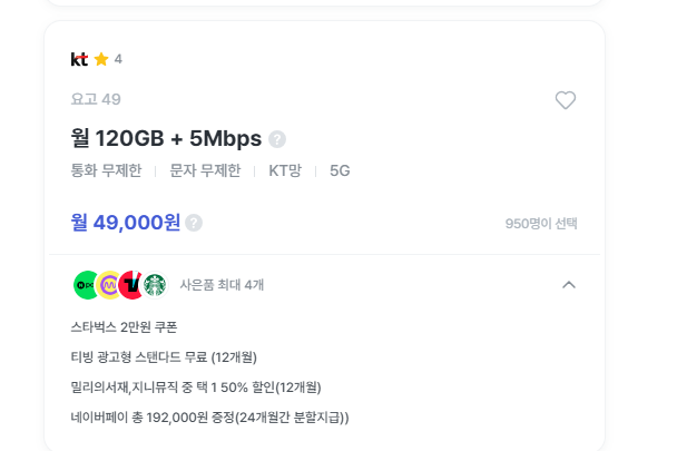 → 티빙 12개월 무료 + 네이버페이 + 커피 쿠폰 - 월 49,000원 / 120GB + 5Mbps