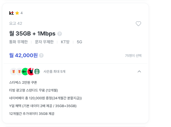 → 티빙 12개월 무료 + 추가 데이터 30GB - 월 42,000원 / 35GB + 1Mbps