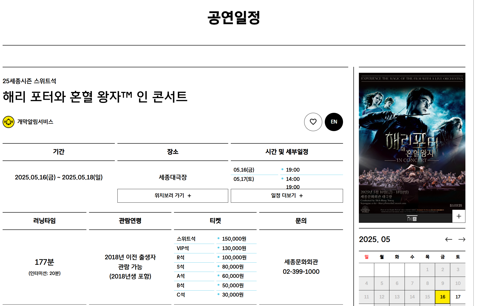 - 세종문화회관 홈페이지 → '2025 세종시즌' → '패키지' → '해리포터 패키지'에서 구매 가능