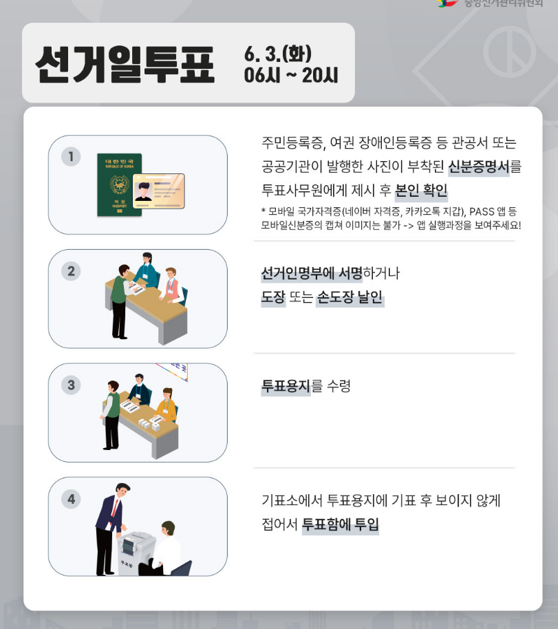 2025년 6월 3일(화) 오전 6시~오후 8시, 주민등록지 기준 지정 투표소에서만 가능합니다. - 신분증을 꼭 가져가야 하나요?